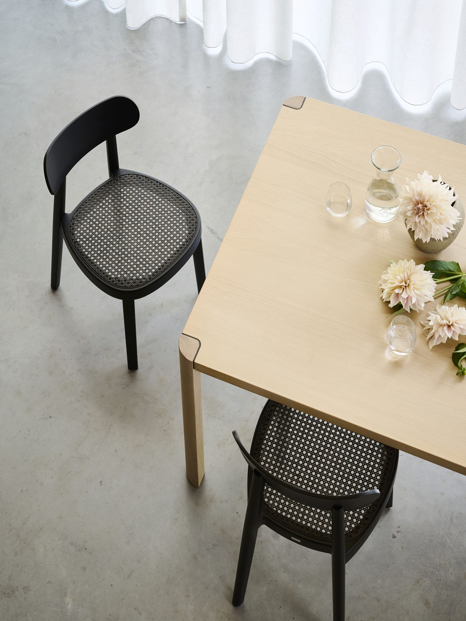 In 2024 presenteerde Thonet het stijlvolle, donkere vlechtwerk DARK MELANGE: een materiaalinnovatie op basis van natuurlijke kleuringsprocessen. Inmiddels is het productieproces gepatenteerd en is het door en door geverfde materiaal als standaardmateriaal opgenomen in het Thonet-portfolio. Vanaf nu zijn vele modellen verkrijgbaar met DARK MELANGE. Deze donkere versie van Thonet’s ‘Weens vlechtwerk’ geeft de populaire klassiekers een geheel nieuwe uitstraling, waardoor ze een statement zijn in in uiteenlopende interieurs.