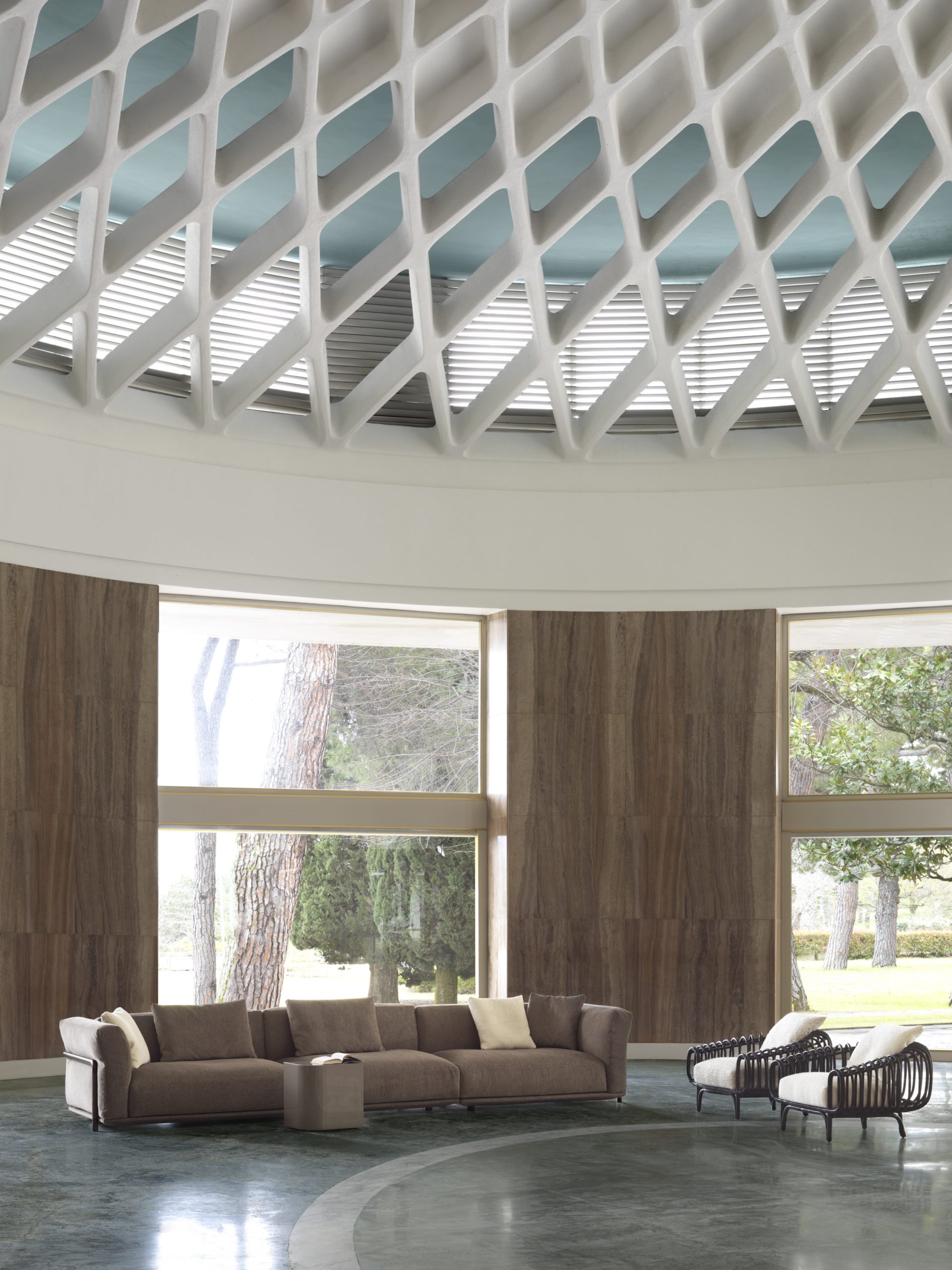 Zachte volumes voor een eclectische atmosfeer: dat kan alleen door Italianen zijn bedacht als omschrijving en dit is ook het geval. Een omgeving waar intimiteit en sociaal gedrag harmonieus worden gecombineerd door deze serie meubelen, aldus Frigerio. Naast opgevulde elementen, textiel, leer, metaal en hout- typische materialen waar dit merk mee zegt te werken- zijn riet en rattan toegevoegd ( ook materialen met een Italiaanse maaktraditie).