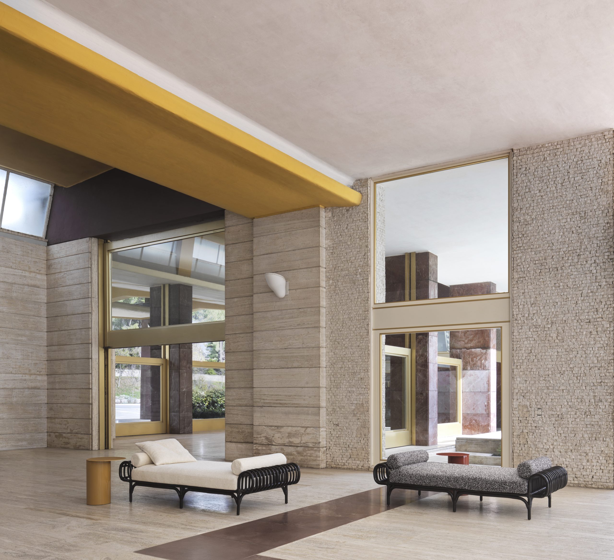 Het resultaat is een mix van levendige energie waarin elk detail bijdraagt aan een bijzondere ervaring. Een meubel uit deze serie bezitten is meer dan eigendom, het staat voor een persoonlijke manier van wonen, zo beweert het merk. De kleurenfoto’s zijn genomen door Gionata Xerra in het Parco Acquasanta, ontworpen door de beroemde architect Pierluigi Nervi in Chianciano Terme, een kuuroord dus. Het meubilair (de serie bestaat uit een fauteuil en een dagbed) past inderdaad mooi in deze omgeving.