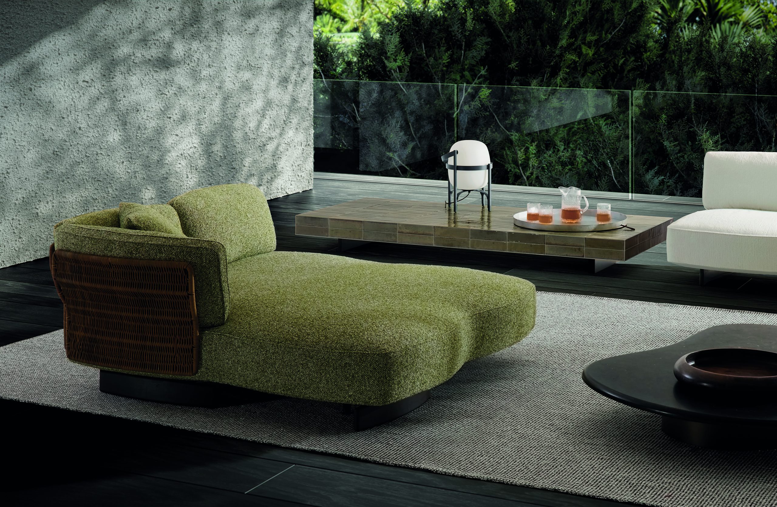 Minotti vindt uiteraard dat het geslaagd is in het vinden van deze harmonie, deze balans: een collectie zonder grenzen die indoor collecties op een nieuwe manier interpreteert. De modellen Bézier door Studio MK27 (bovenaan en daaronder) en Saki van Nendo Hierboven en hieronder) zijn voorbeelden hiervan. Organisch en modulair, met innovatieve en ongebruikelijke materialen die zowel technologisch vooruitstreven als een lust voor het oog zijn. Een gelakt oppervlak dat weersbestendig is, afwerkingen met keramische tegels en verfijnde metallic kleuren. Dit spreekt interior designers van uit de hele wereld aan, zo weet de fabrikant.