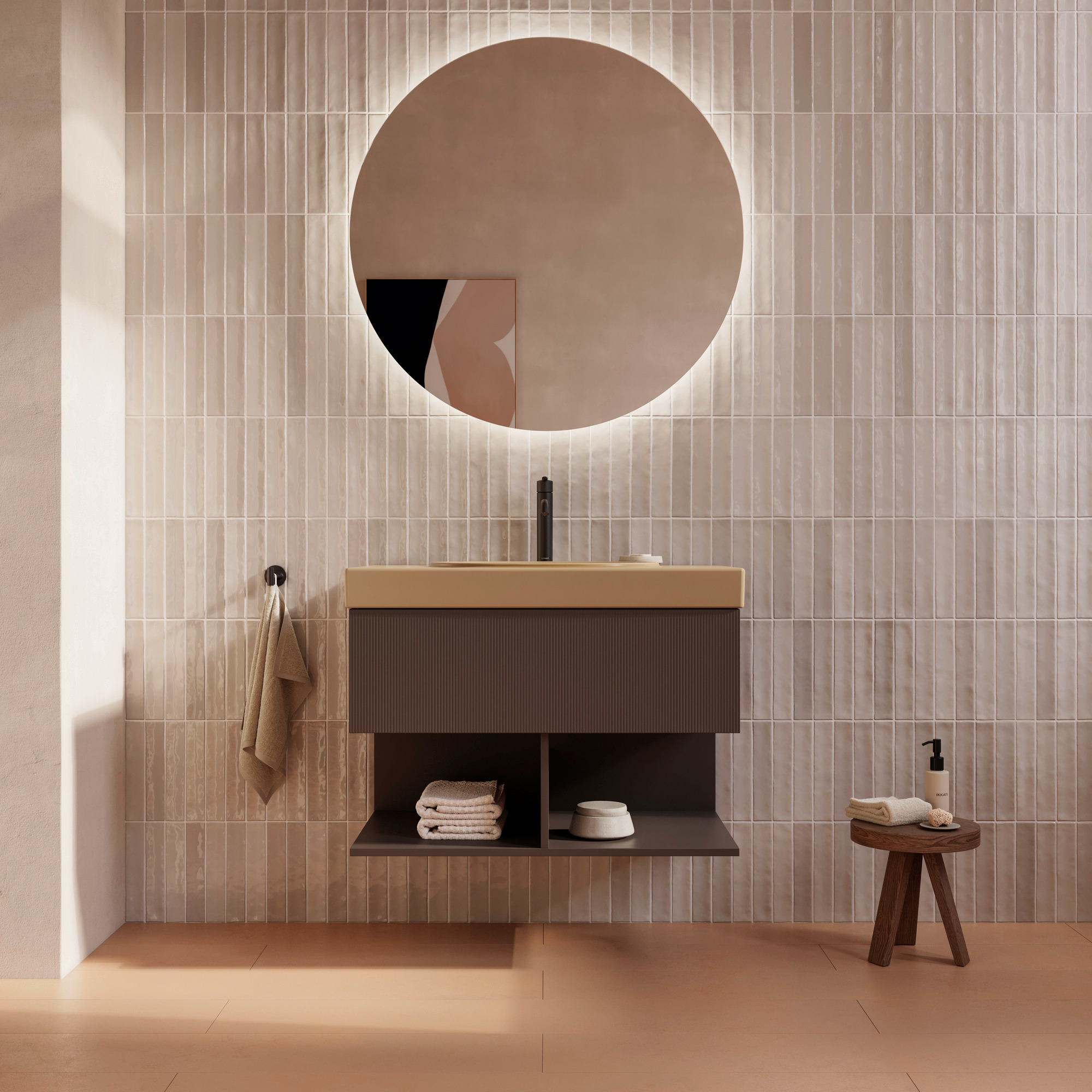 Patricia Urquiola licht toe: “We wilden laten zien dat zelfs zo functionele elementen als een wastafel of een bidet een eigen expressieve kracht kunnen hebben. We hebben meer dan een jaar aan deze installatie gewerkt. Het resultaat is een klein ‘teatrino’ – een veld van totems en objecten die met elkaar in dialoog treden en nieuwe perspectieven openen op de badkamer als ontworpen leefruimte.”