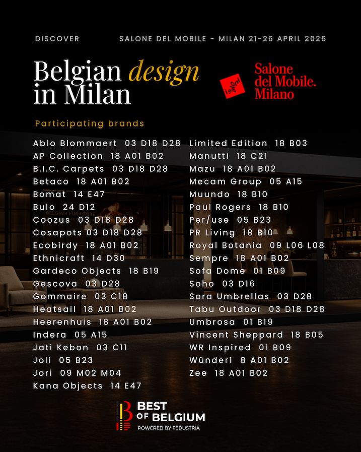 Naast de presentatie in Brera is België ook prominent aanwezig op de Salone del Mobile zelf, met vier gezamenlijke stands van Fedustria en een brede vertegenwoordiging van merken zoals AP Collection, Heerenhuis, Ecobirdy, Mazu, Sempre en Zee. Daarmee wordt de spreiding en slagkracht van het Belgische designlandschap extra in de verf gezet.