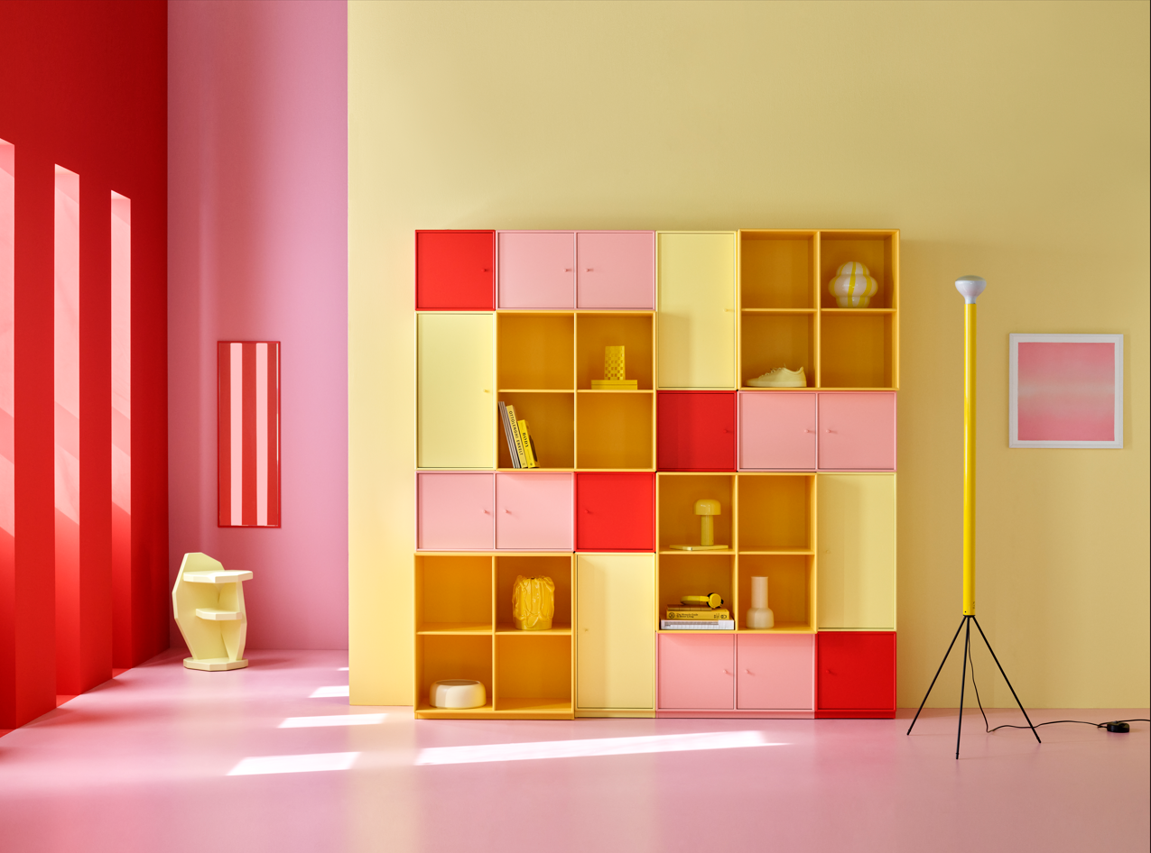 Ze is in het kleurrijke universum van Montana gedoken en het resultaat ziet u hier: bovenaan de composition 2 in Balsamic, Clay, Pine en Ruby en hierboven de Wardrobe in Ruby. Hieronder composition 1 in de nieuwe kleuren. Het pure plezier van kleuren spat ervan af.