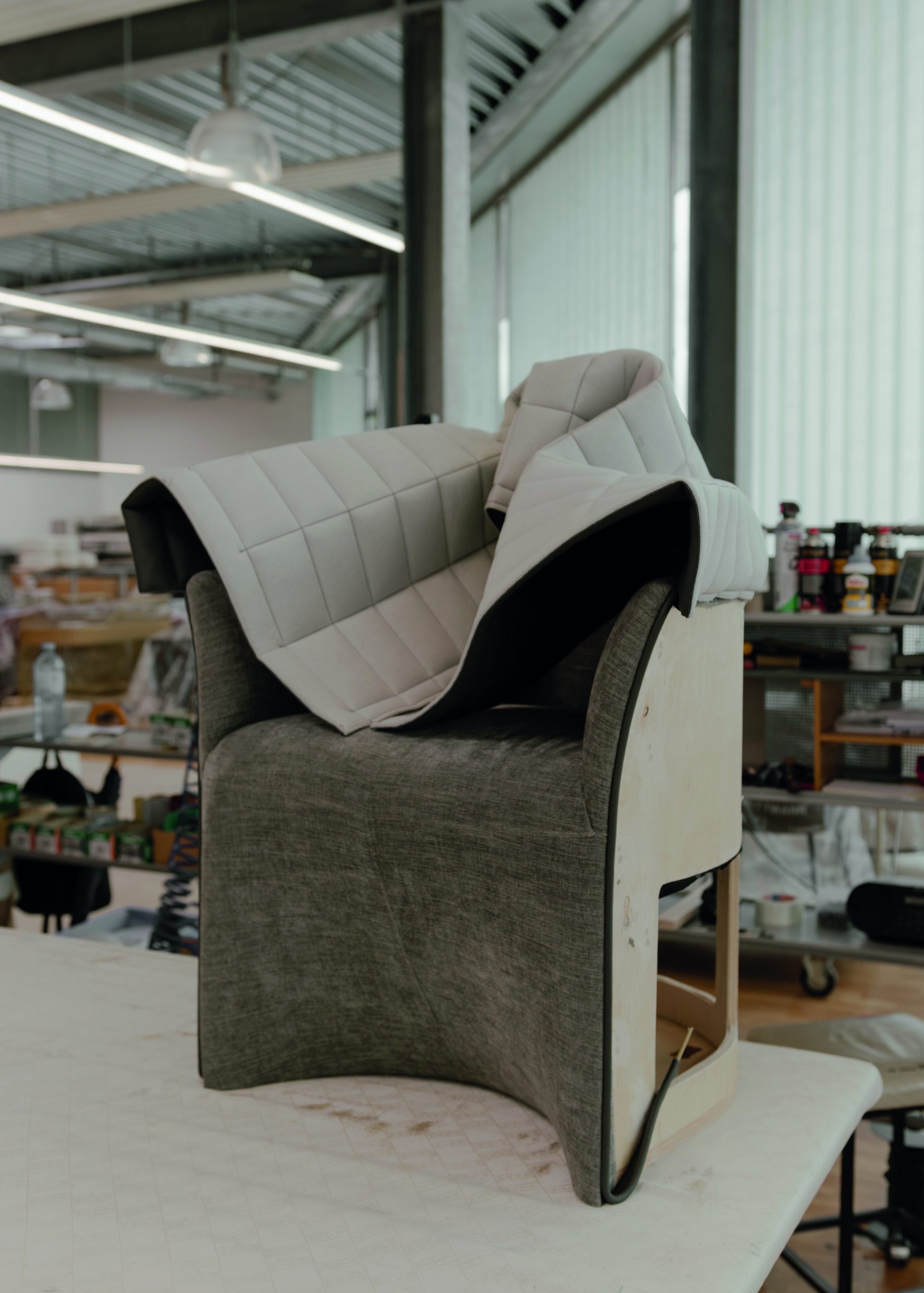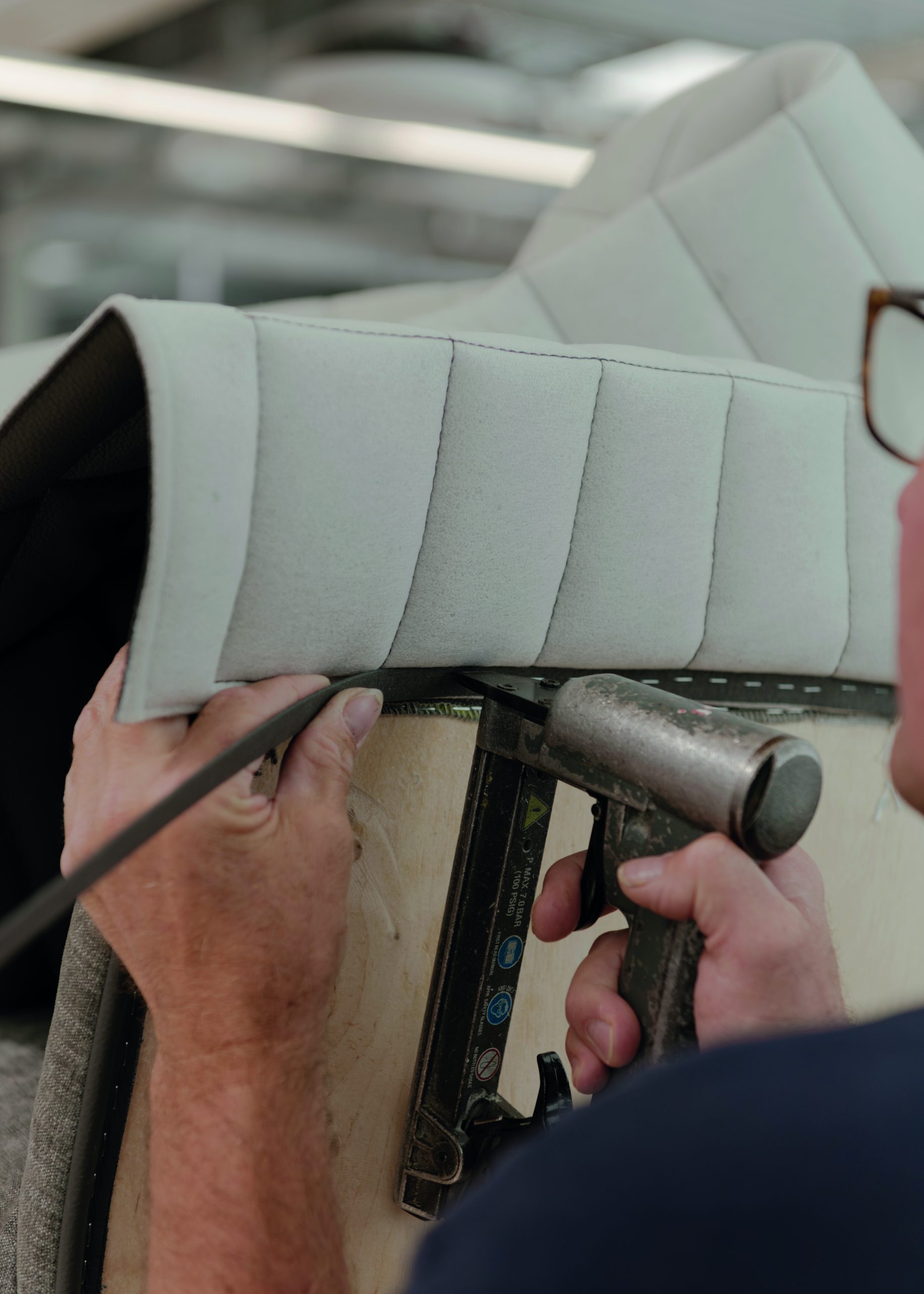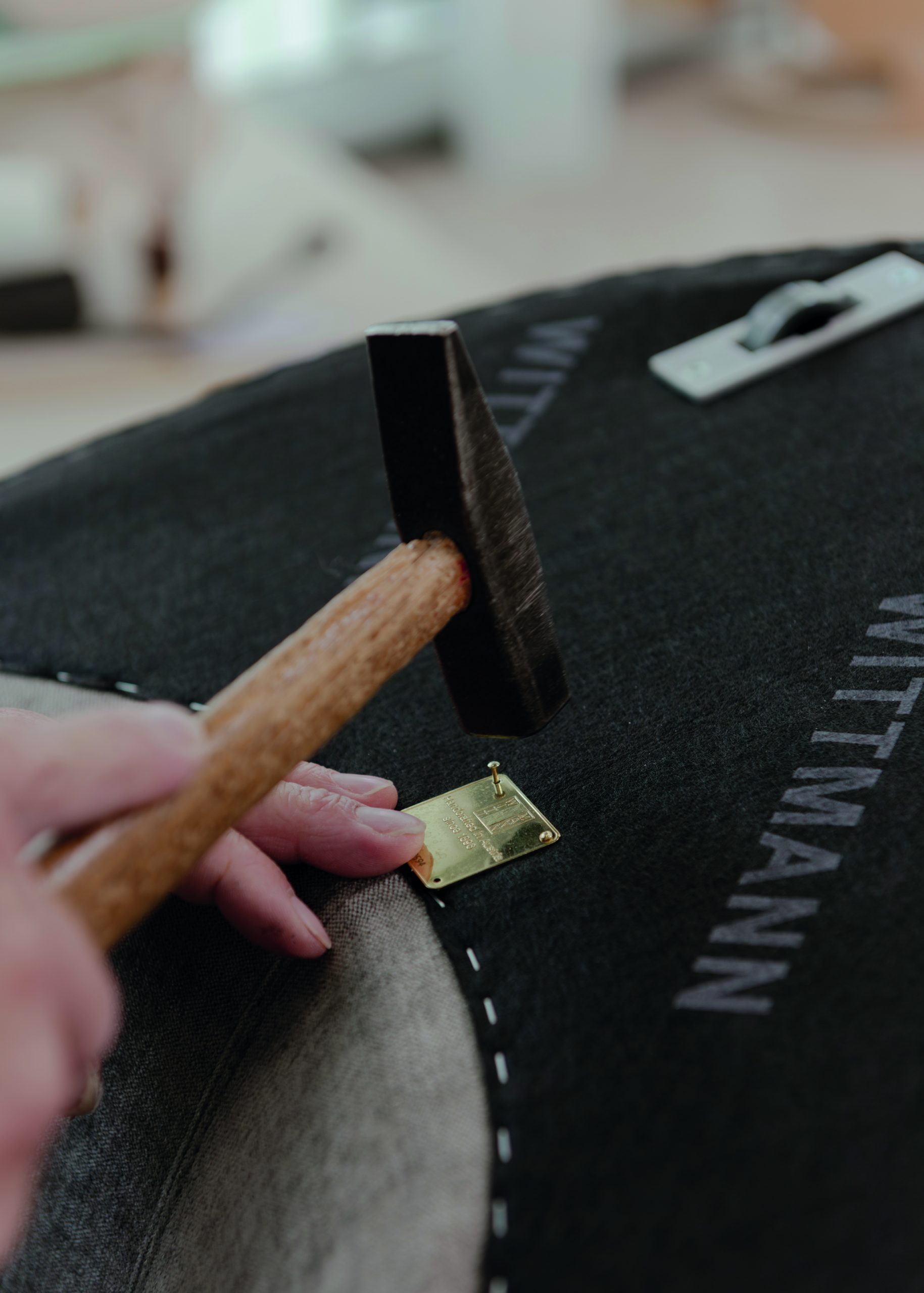 De zitting bevat pocketveren en een complexe schuimstructuur uit polyurethaan. “De stoffeerders krijgen het model met schuim en veren om te stofferen en dankzij hun jarenlange ervaring zijn ze in staat om de stoel exact zo te stofferen zoals de bedoeling is. Het is voor hen een meesterproef geweest toen de eerste modellen gemaakt moesten worden. De armleuningen zijn echt lastig om te stofferen, maar inmiddels heeft iedereen de slag te pakken.” Tot slot krijgt iedere stoel een gouden Wittmann plaatje gemonteerd, gesigneerd door de stoffeerder. Het model is een soort hybride meubel, tussen een stoel en een fauteuil in, en past zowel thuis als op kantoor of in een lobby. De stoel kan eventueel met wieltjes worden uitgevoerd (zowel zichtbaar als onzichtbaar) en past zo aan de eettafel of de vergadertafel.