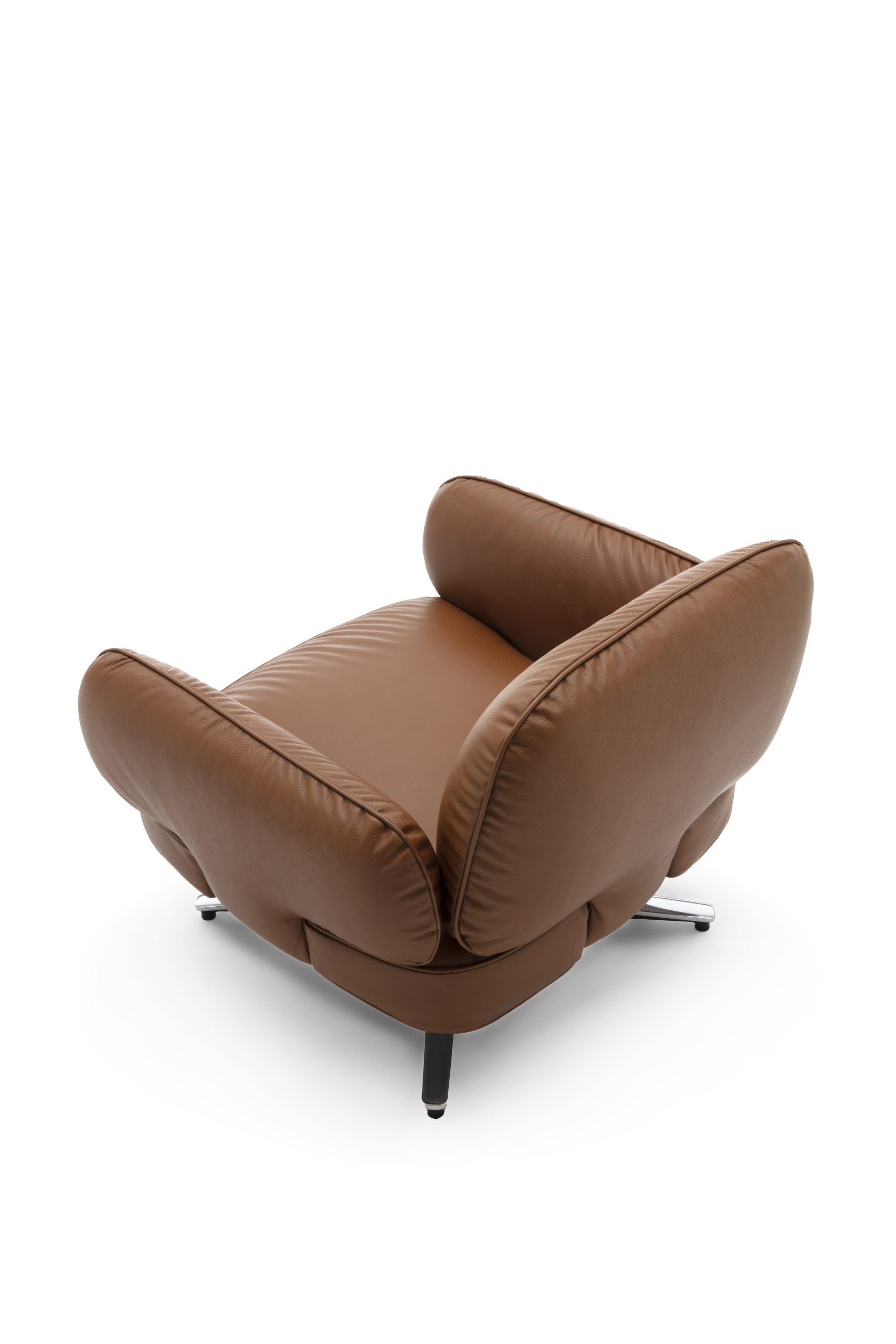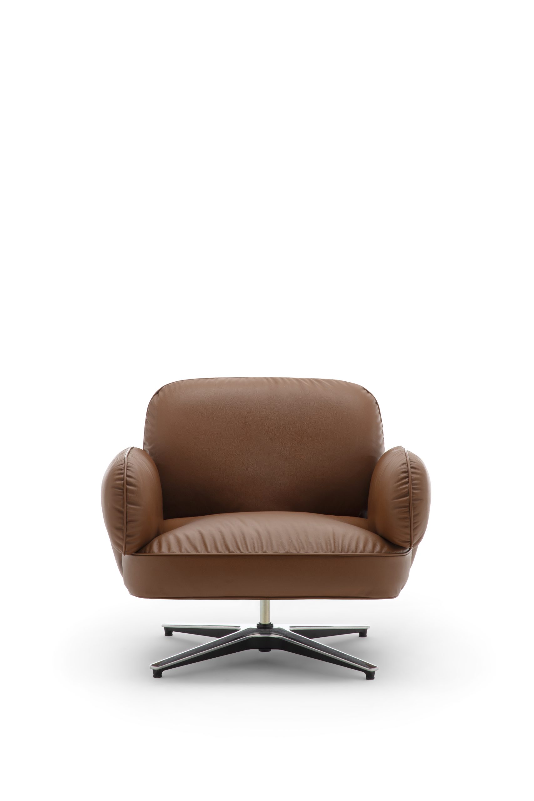 Zoals de afgebeelde DAFNE van Gordon Guillaumier; een fauteuil die afgeleid is van de grote klassiekers van het Modernisme, met een gevulde zitting en rug op een stevig gegoten aluminium sterpoot. Heldere lijnen, precies getekend, en verzacht door zitting, rugleuning en armsteunen. Een rechthoekige vorm met afgeronde randen, functioneel en elegant, maar meer dan simpel decoratief, zo bezweert Frigerio ons. Met royale afmetingen voor persoonlijk comfort, thuis en in projecttoepassingen. Als draaistoel of relaxmodel, in leer, textiel, met een metalen basis. DAFNE meet 95 x 88 x 74 cm. De foto van de ontwerper en zijn hond (ervan uitgaande dat het zijn hond is) is van Andrea Ferrari.