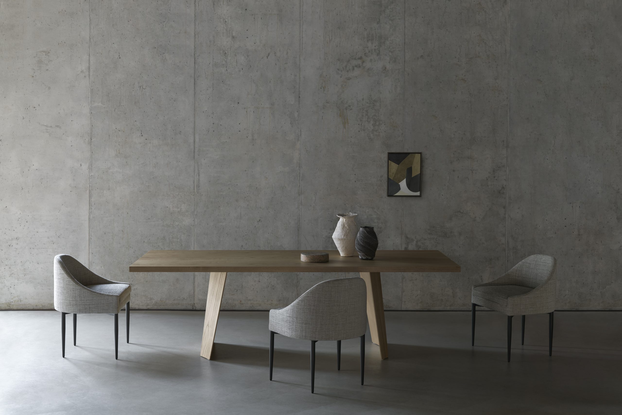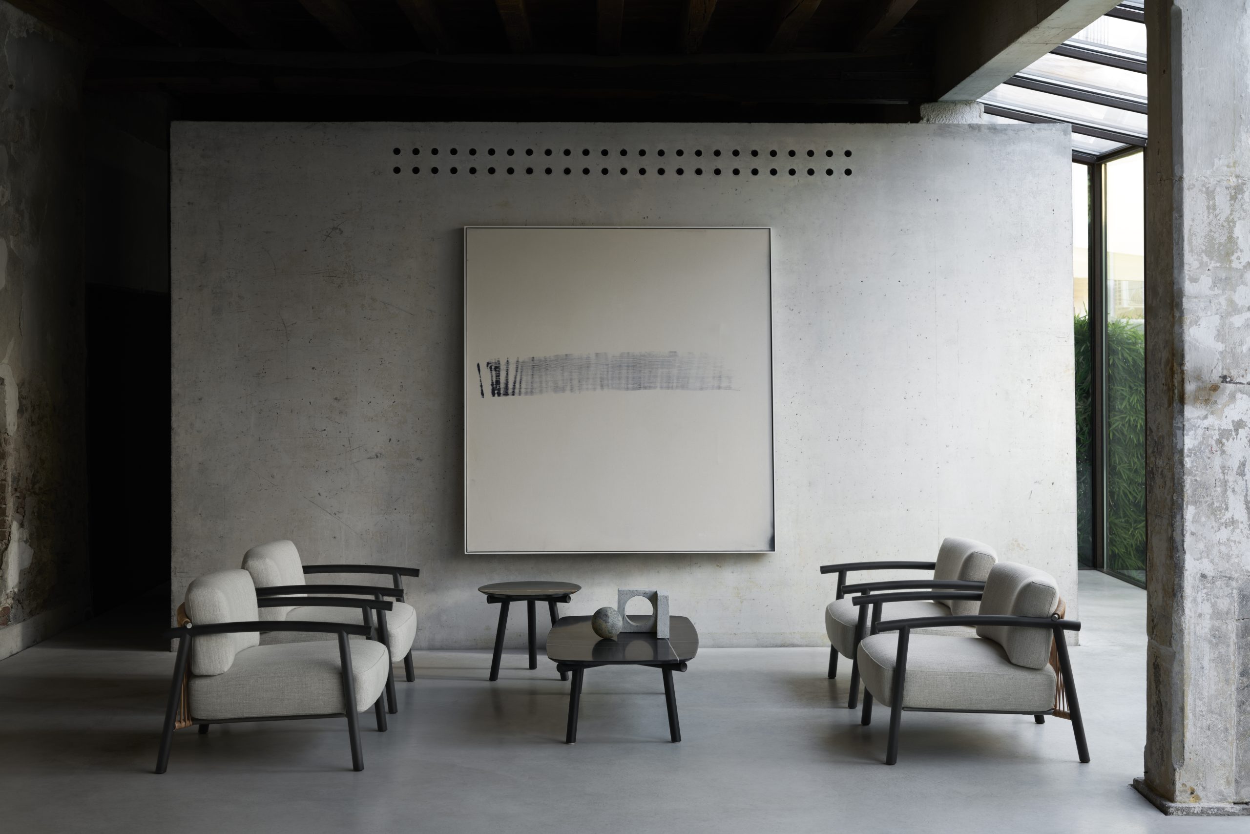 De laag zittende Gala is er als sofa en als fauteuil (zie de foto bovenaan). Zacht, elegant, afgeronde vormen. Aanwezig in de ruimte zonder te domineren. Echoo is er ook als sofa en fauteuil, maar is meer aanwezig. Kasumi is een fauteuil met een bijpassende bijzettafel (foto hierboven). Raki is een kleinere fauteuil waar de salontafel Wedge weer bij past (foto hieronder). Etoile is een bartafel en daar horen dan weer de nieuwe Pebble barkrukken bij (helemaal onderaan te zien).