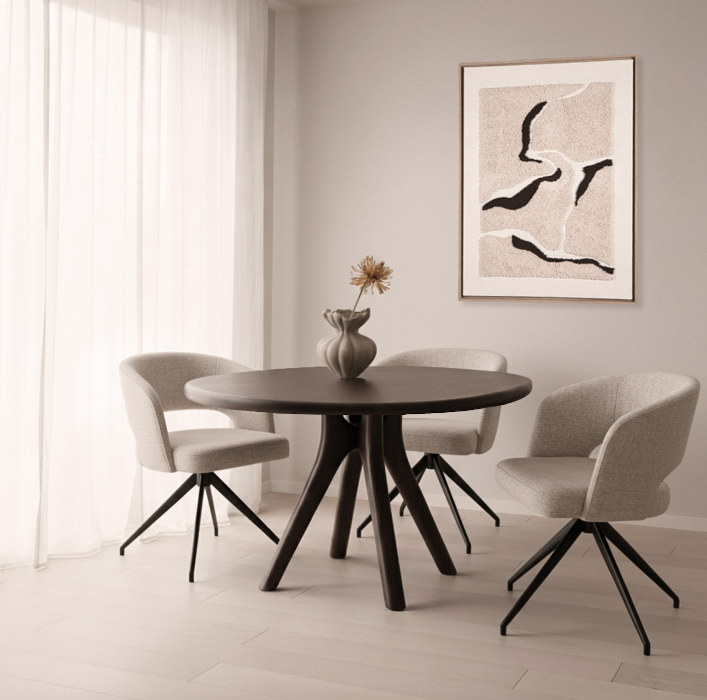 De nieuwe eettafel Addo, uitgevoerd in massief hout in onder andere een actuele stuiver vorm met een mooie finish. Stoel Claus is een compleet nieuwe actie stoel, deze is uitgevoerd met een 360 graden draaisysteem.