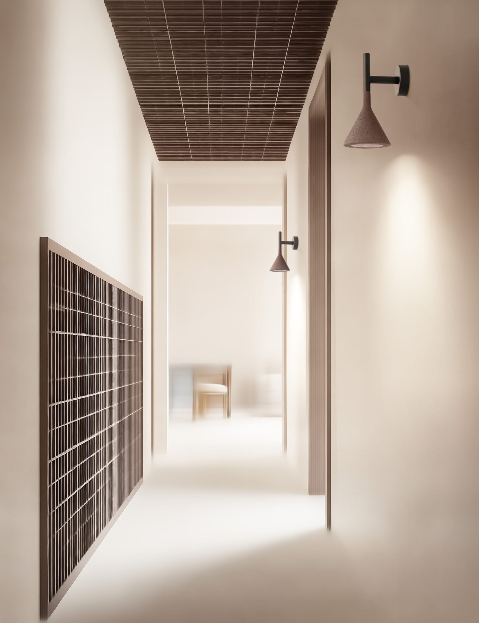 .Aplomb is een zeer succesvolle familie van lampen, geïnterpreteerd in verschillende versies, maten en kleuren, verkregen door pigmenten rechtstreeks toe te voegen aan het mengsel van het beton. Vandaag, met de première van de nieuwe wandvariant voor binnen- en buitengebruik, breidt de collectie zich uit om een veelzijdige en onderscheidende oplossing te bieden waarmee huiselijke ruimtes en contractprojecten, binnen en buiten, kunnen worden gepersonaliseerd.