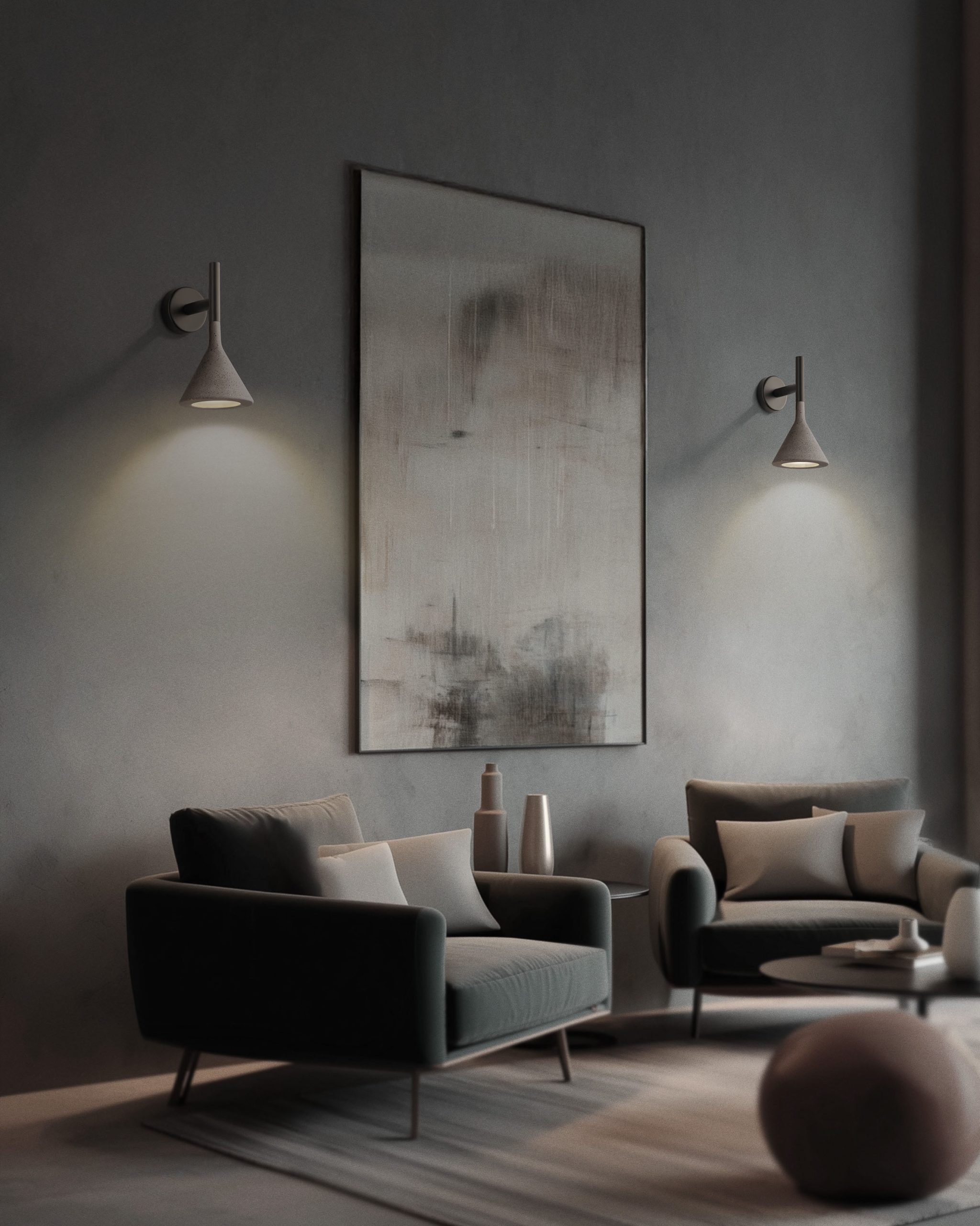 Elegantie, lichtheid, strakke vormen: het opvallende kenmerk van Aplomb is het gevoel van het onmogelijke dat mogelijk wordt. Het essentiële ontwerp brengt de rijke kwaliteit van het materiaal naar voren, een speciaal type beton. De lamp is nu ook verkrijgbaar in een nieuwe wandversie.