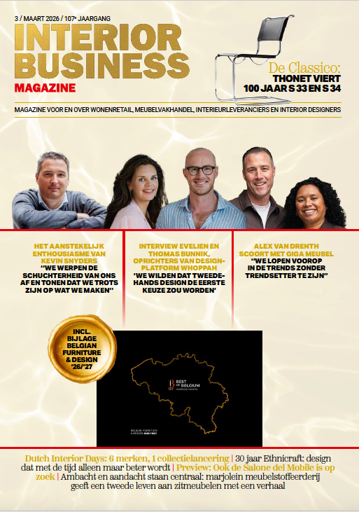 De nieuwste editie van Interior Business Magazine (maart 2026) verscheen vorige week en sloeg -letterlijk- in als een bom. Ruim 300 prachtige pagina’s ploften op de mat van onze abonnees. 300 pagina’s met inspirerende ondernemersverhalen, internationale marktanalyses, interviews, kritische columns en… de jaarlijkse bijsluiter in de vorm van het door de redactie van Interior Business Magazine vervaardigde compilatie boek ‘Belgian Furniture and Design 2026-2027’: deze uitgave laat zien hoe dynamisch en gelaagd de sector momenteel is.