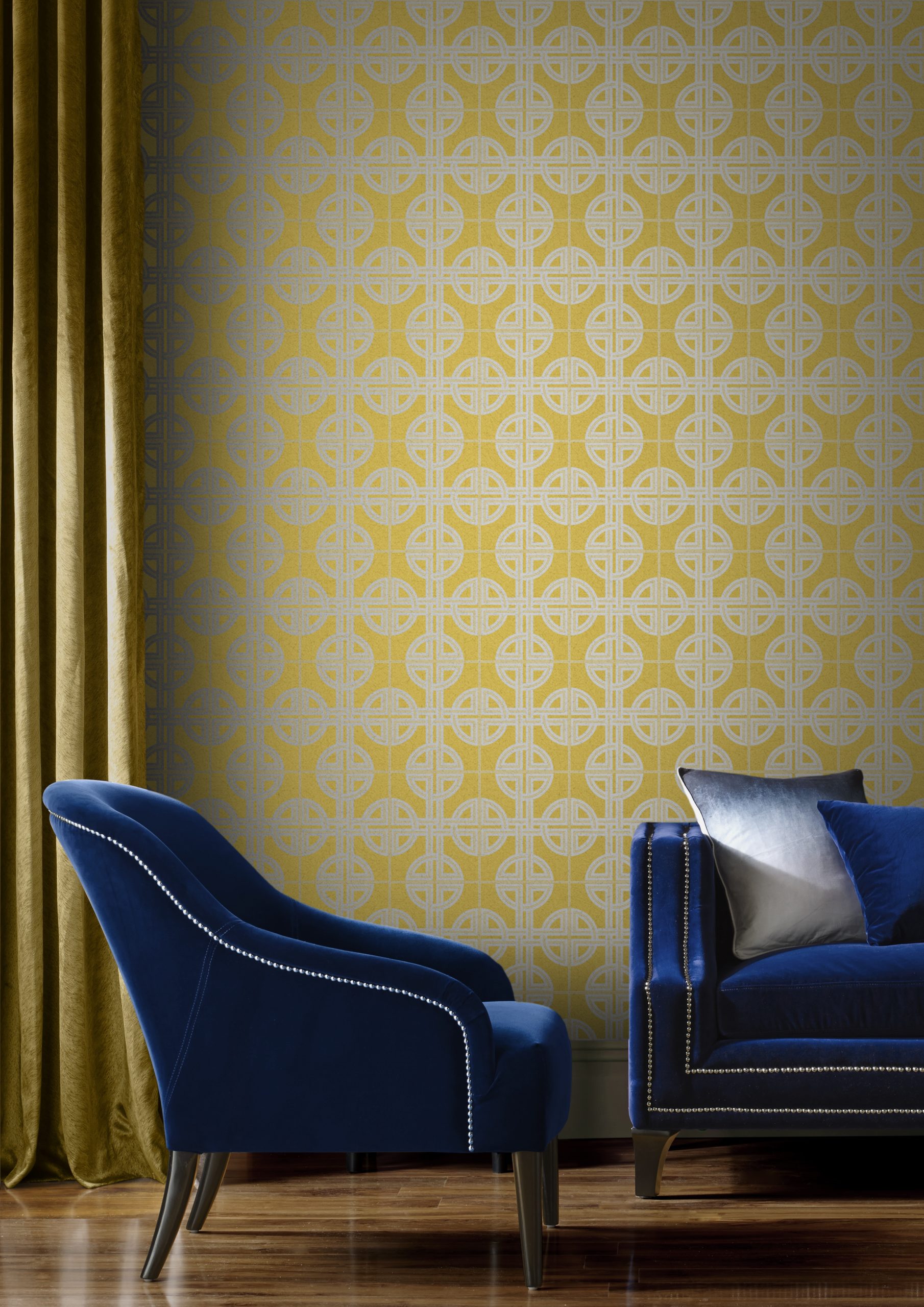 Bij Asian Lattice Saffron (hierboven) wordt een traditioneel, Oosters patroon gecombineerd met modern, zilver metallic. De saffraangele achtergrondkleur zorgt voor een levendige uitstraling. Het zilveren, geometrische ontwerp geeft een moderne kijk op een klassieke compositie. De kalmerende, moerbeikleurige achtergrond, versierd met een trendy koperen patroon zijn de kenmerken van behang Asian Lattice Blush.