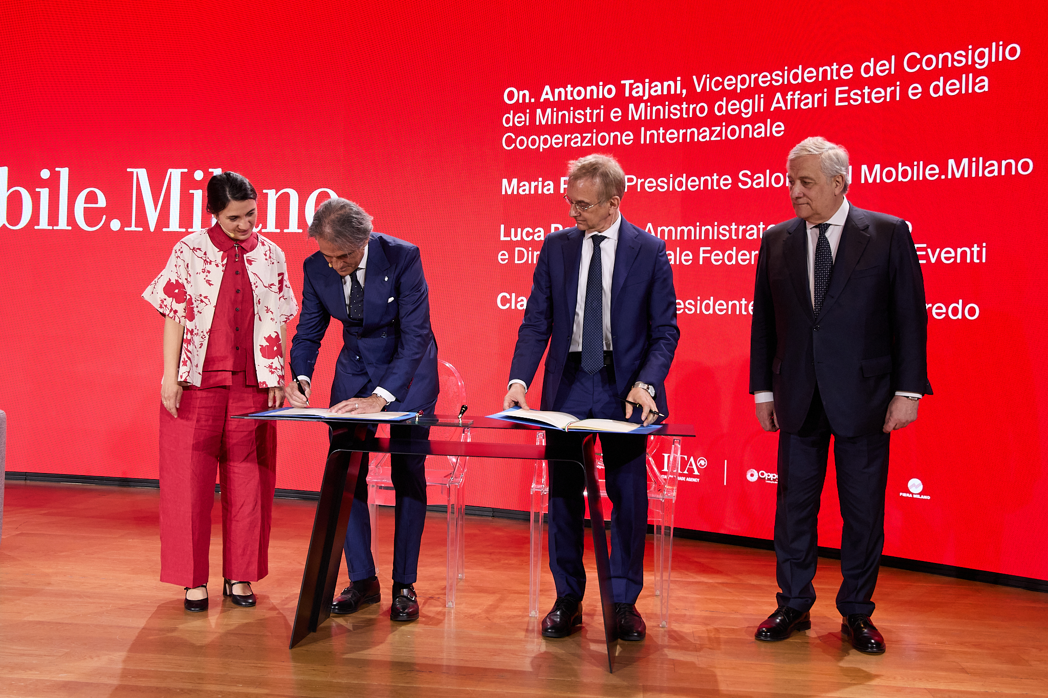 Op de foto bovenaan staan van links naar rechts: Antonio Tajani, Vice Premier en Minister van Buitenlandse Zaken en Internationale Samenwerking, Luca Palermo, Chief Executive Officer, FederlegnoArredo Eventi S.p.A., Maria Porro, President Salone del Mobile.Milano en