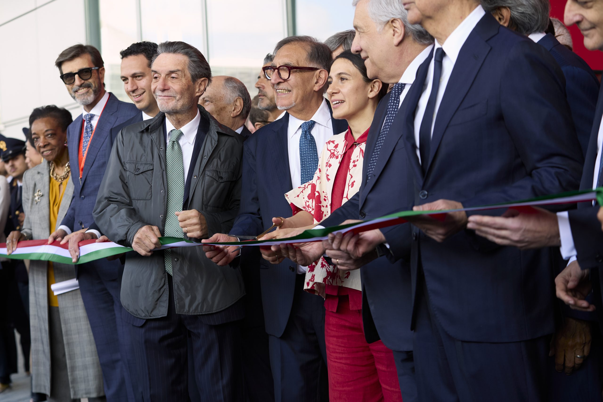 Claudio Feltrin, President FederlegnoArredo. Bij het doorknippen van het lint staan links en rechts van Maria Porro Senator Ignazio La Russa, Voorzitter van de Italiaanse Senaat, Minister Antonio Tajani, Giuseppe Sala, Burgermeester van Milaan, Attilio Fontana, President van de regio Lombardije en Claudio Feltrin.