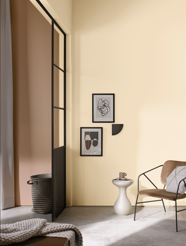De verffabrikant vervolgt: “Een rustgevend, zen interieur hoeft zeker niet alleen maar minimalistisch te zijn. Een sereen interieur kan juist net heel warm en geborgen aanvoelen, afhankelijk van de kleuren die je gebruikt. Met #303 calm down in de basis, komen natuurlijke, sterke kleuren nog beter uit. Kies bijvoorbeeld voor een muur in de zeeblauwe #454 vitality boost, de warme zandkleur #373 aromatic of de wijnrode #535 showtime. Door een verscheidenheid aan materialen toe te passen, van een aaibare vacht tot grof linnen, zet je de toon voor een sfeervolle maar aardse sfeer.”