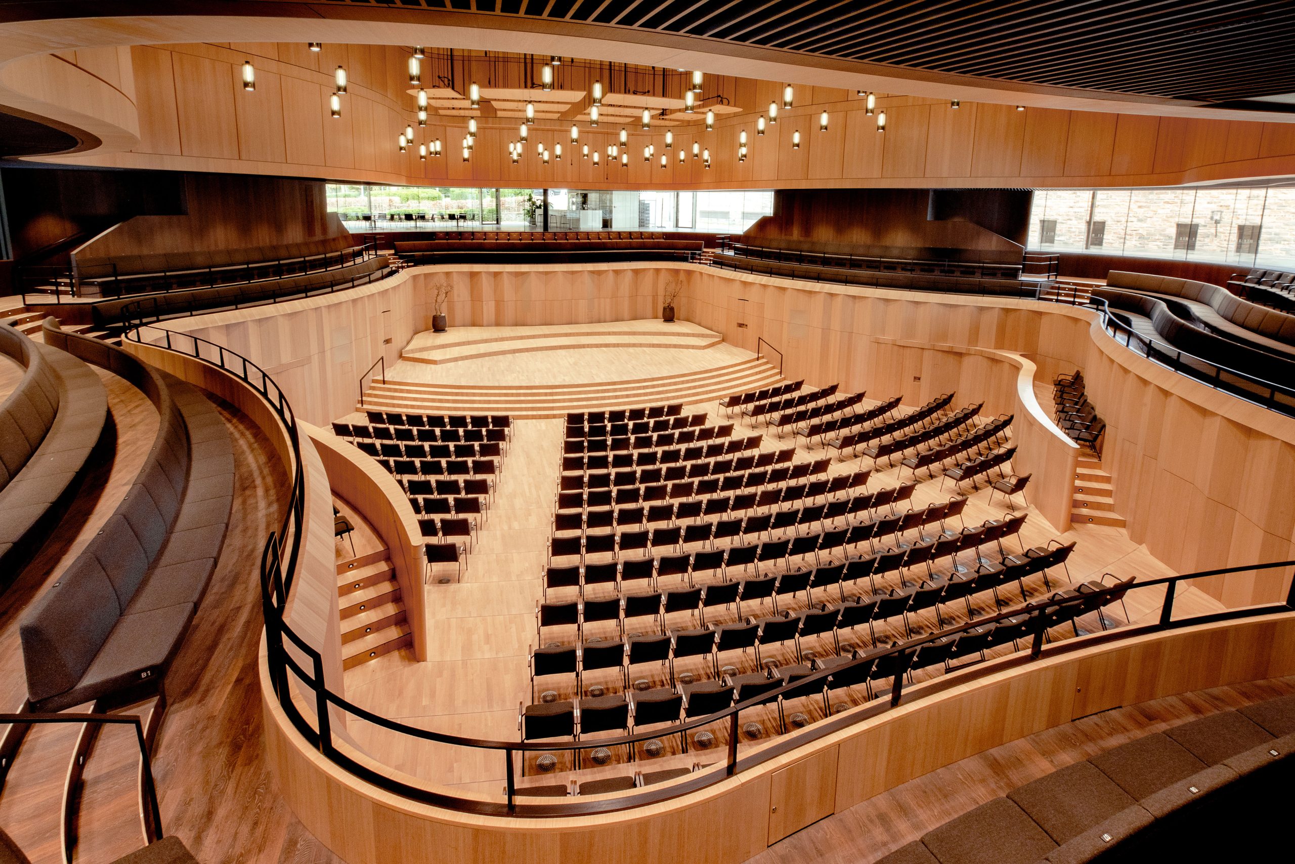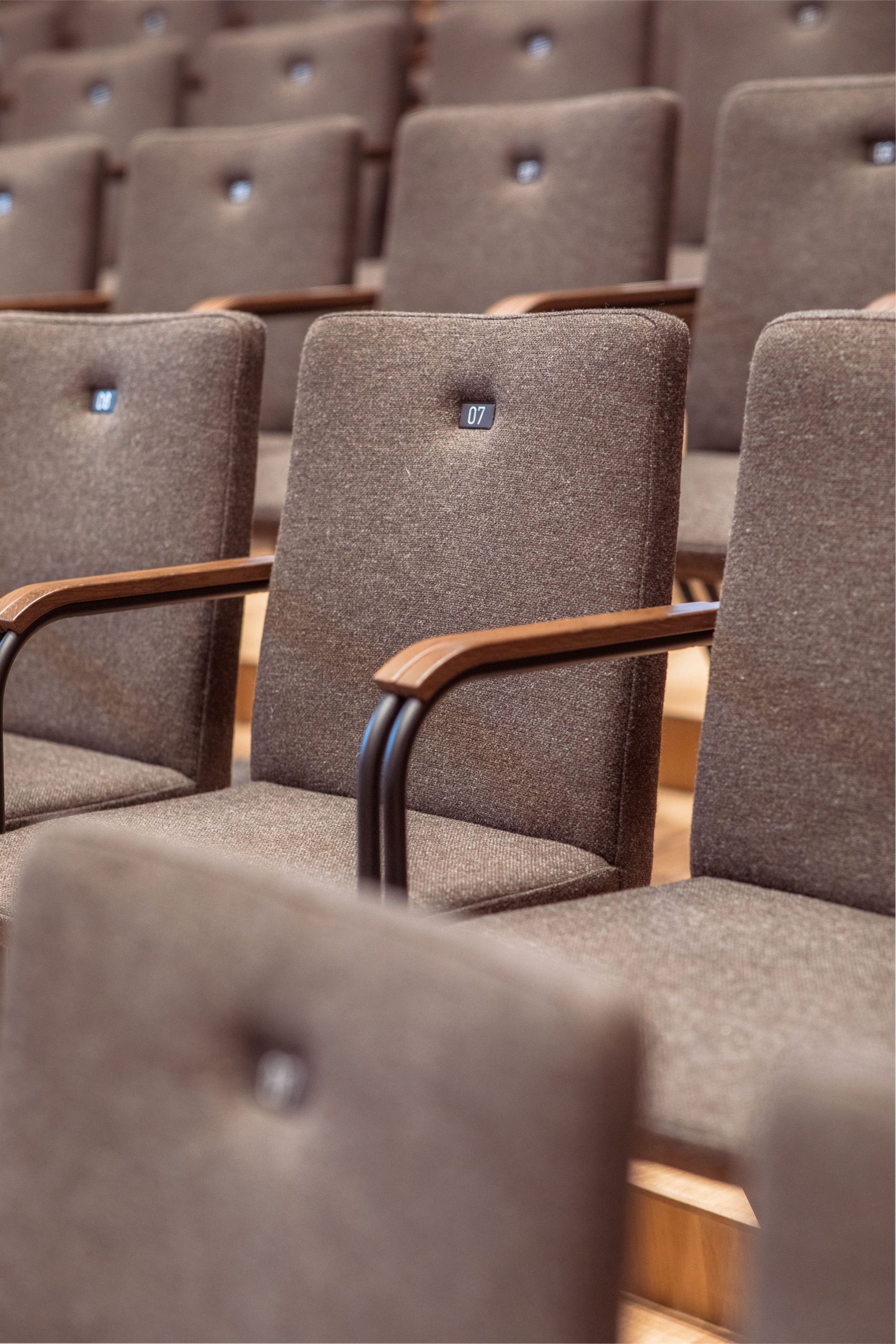 Stoelen voor concertzalen moeten niet alleen voldoen aan de bekende veiligheidsnormen voor projectinrichtingen, maar ook aan bijzondere akoestische eisen. Daarom heeft Thonet voor deze concertzaal een speciale versie ontwikkeld van stoel S 169 PVF, die geïntegreerd is in de totale akoestiek van de concertzaal. De stoelen zijn bekleed met de donkerbruin-zwart gemêleerde stof Hallingdal 65, een mix van wol en viscose. Deze stof harmonieert met het hout van de holle en bolle plafond- en wandelementen van de zaal. In het midden van de rugleuning zit een rechthoekige uitsparing waarin goed zichtbaar een zitplaatsnummer kan worden aangebracht. Op de zwart gepoedercoate stalenbuis-armleuningen liggen armleggers van gebogen en in vorm gefreesd gerookt eiken. De randen van het hout zijn iets afgerond en de bevestigingspunten zijn niet zichtbaar.