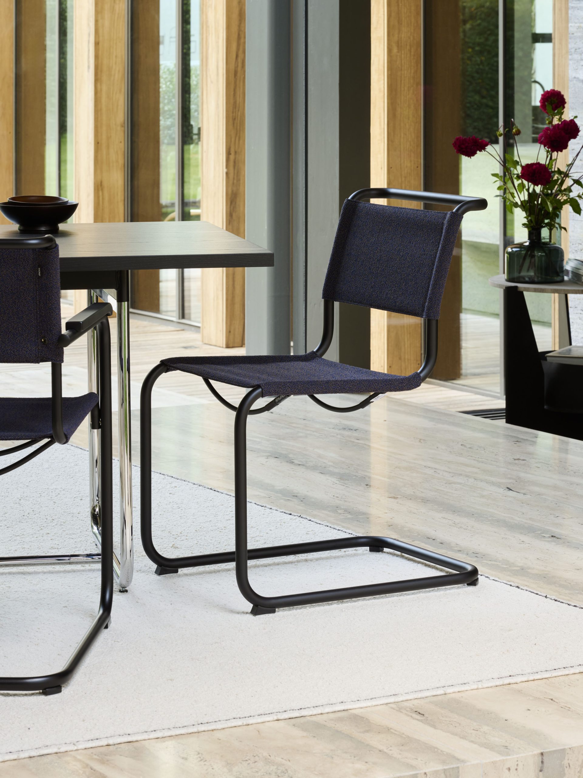 Met de nieuwe stoffen bespanning blijven de S 33 V ‘Soft’ en de variant met armleuningen S 34 V gelinkt aan hun oorsprong, maar staan ze ook open voor nieuwe contexten. De subtiele verhoudingen en de kubusvorm van het oorspronkelijke ontwerp zijn behouden gebleven, terwijl het textiel van de bespanning een ‘plastische visualisatie van comfort’ biedt, zoals creative director Norbert Ruf het formuleert. De S 33/S 34 V ‘Soft’ onderscheidt zich door een aangenaam warme uitstraling en extra zitcomfort. Hij past perfect aan de eettafel, een bureau of als extra stoel in slaap- en logeerkamers. Dankzij de mogelijkheid om de stof individueel af te stemmen op materiaal- en kleurconcepten, past deze stoel flexibel in de meest diverse interieurs en is hij geschikt voor woonruimten, maar ook zakelijke settings.