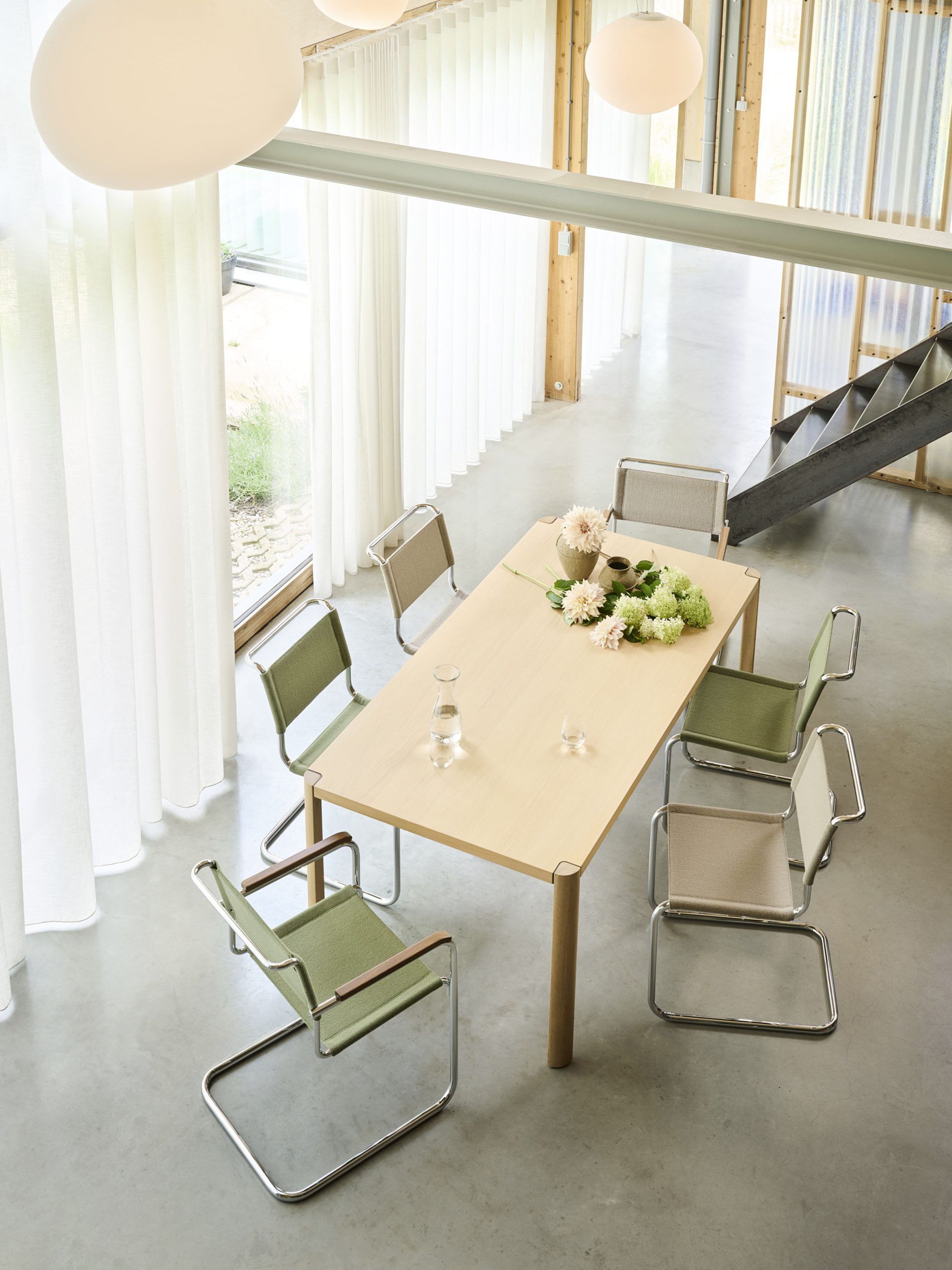 Voor de stof is er is veel keuze uit de standaardcollectie van Thonet. De verchroomde versie met stoffen bespanning in natuurtinten benadrukt de Bauhaus-roots van de stoel, maar doet wel veel zachter aan dan de strakke klassiekers met lederen bespanning. Het zwart gepoedercoate frame daarentegen geeft de stoel juist een elegante, degelijke uitstraling. Gecombineerd met donkere stoffen ontstaat daarmee een tijdloos en professioneel geheel. En voor een gezellig en speels effect zijn juist de modellen met wit frame en pastelkleurige stof heel geschikt. De frisse kleurcombinaties breken met de strenge Bauhaus-uitstraling en maken de S 33/S 34 V ‘Soft’ tot een zachte, comfortabele stoel.