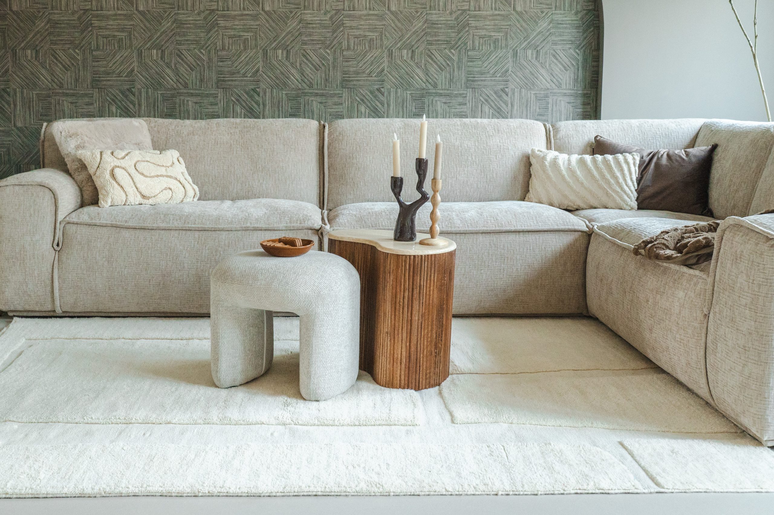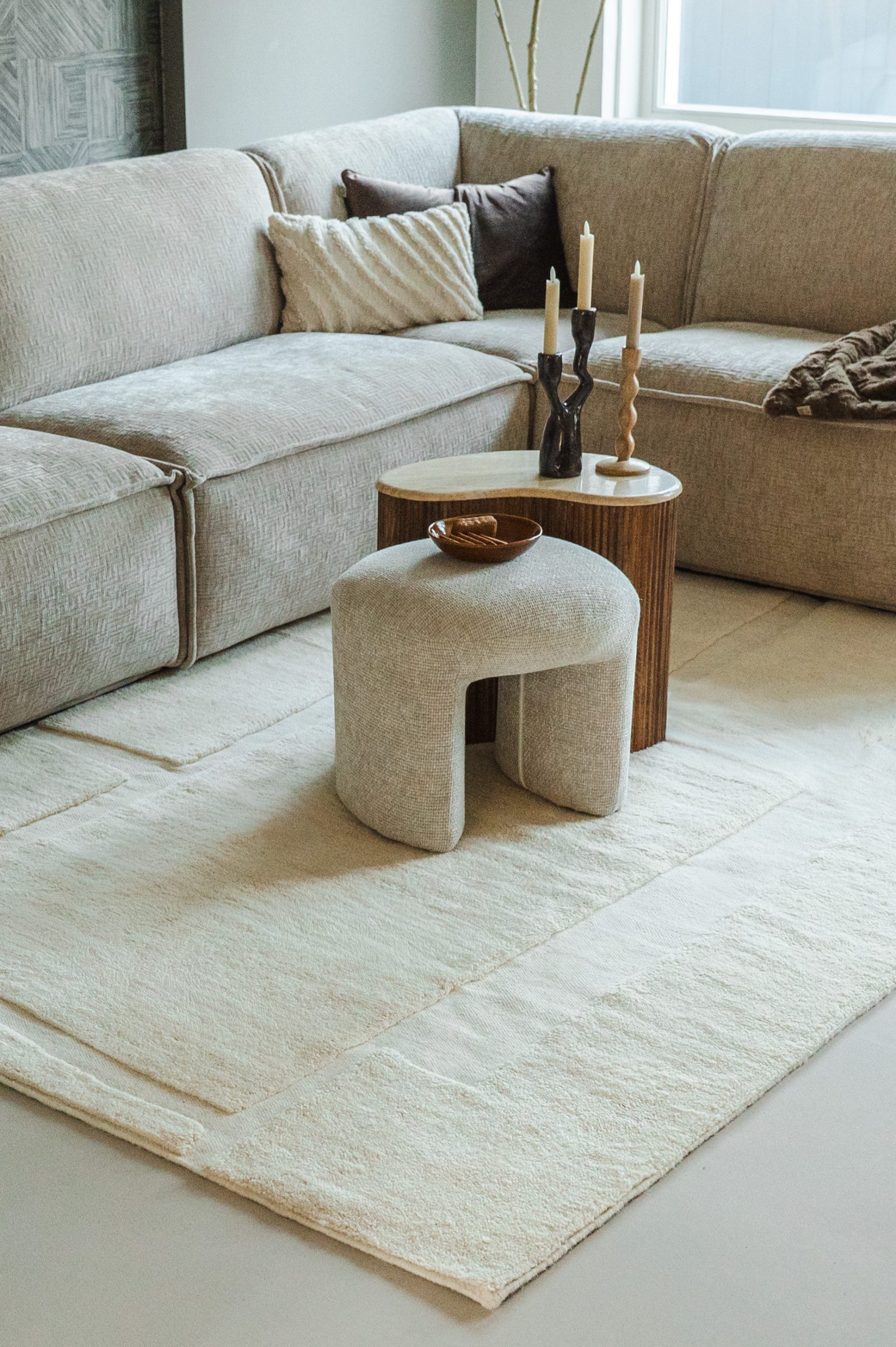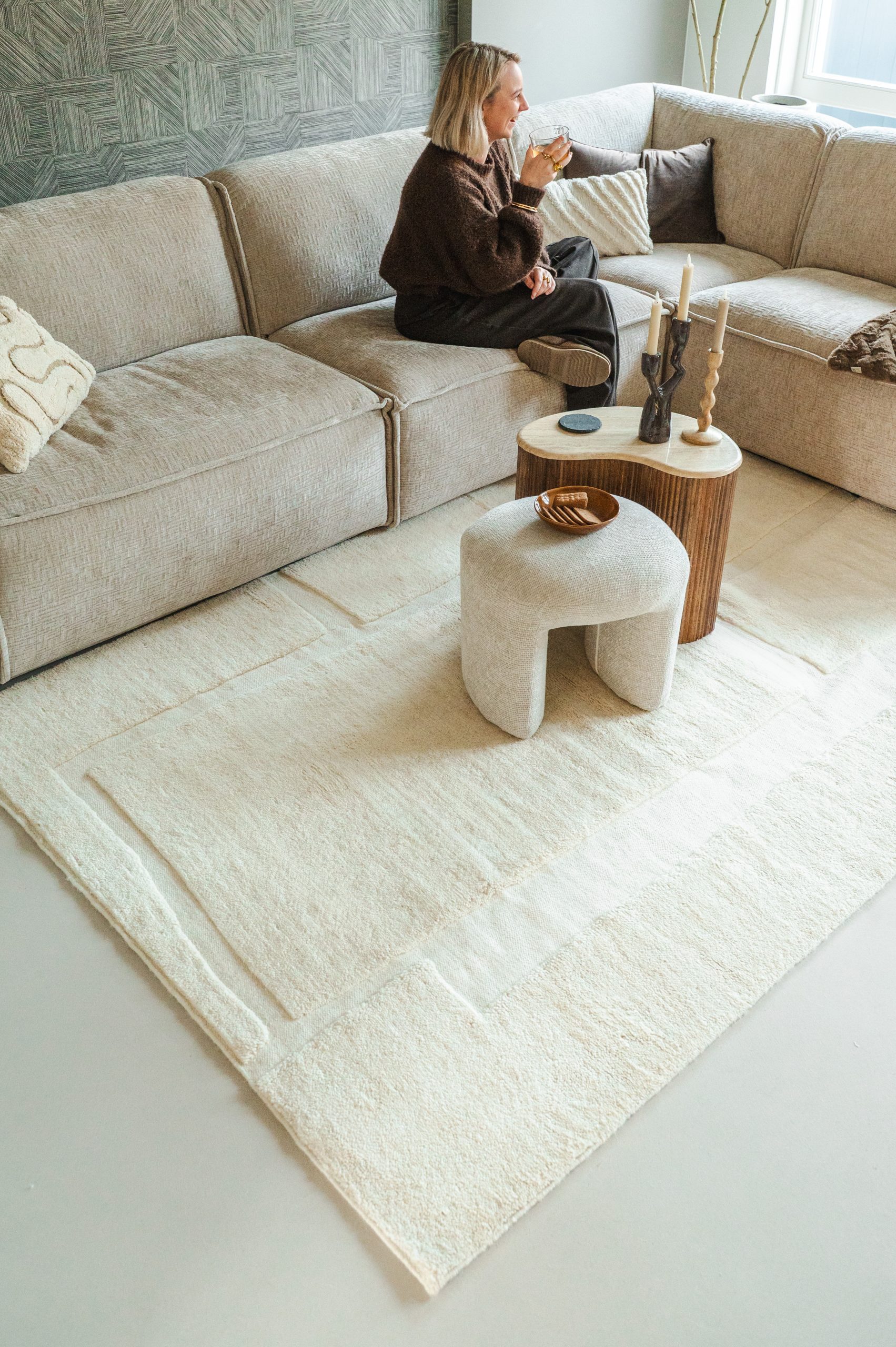 Judith: “Een vloerkleed is voor mij een belangrijk element in het interieur. Het moet vooral zacht en warm aanvoelen, zodat je meteen dat fijne thuisgevoel krijgt. Ik hou zelf van hoogpolig, juist omdat je daarmee mooie contrasten kunt maken, bijvoorbeeld een stoere stenen salontafel op een zacht vloerkleed. Met deze collectie wilde ik vloerkleden ontwerpen die rustig zijn, maar wél sfeer geven. Tijdloos, met subtiele structuren en passend bij een interieur waarin je echt wilt leven.”