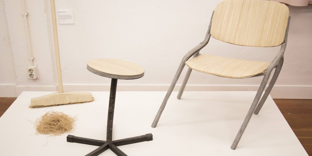 Zowel de stoel, de bezem als de kruk zijn volledig gemaakt van duurzaam linoleum. Op de vloer ligt haar in de vorm van jute, dat gebruikt wordt als rug van Forbo’s linoleumvloeren. De beelden van Shun Yoon met hun rafels en scheefheid lijken een commentaar te zijn op onze samenleving waarin alles er altijd perfect moet uitzien.